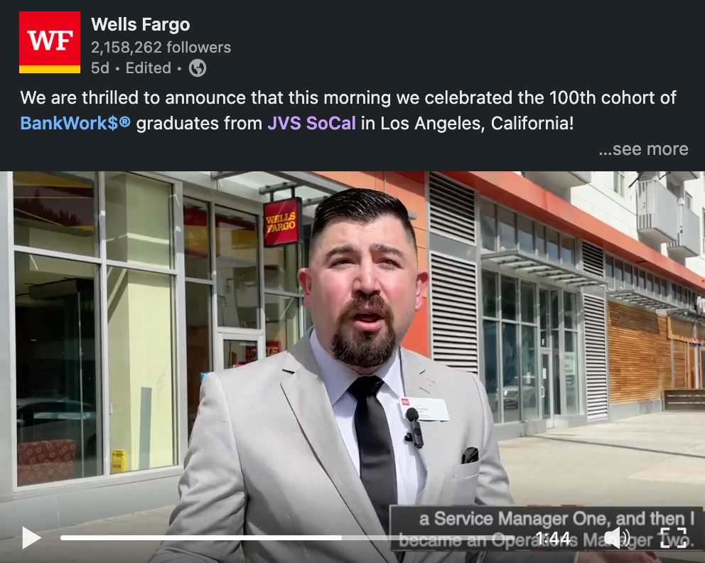 A featured alumni story highlighting a CareerWork$ graduate now employed at Wells Fargo, focused on career progression and program impact.